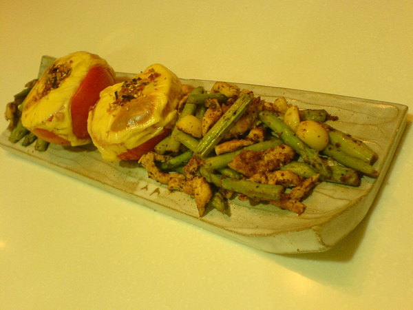 2.將蘆荀興雞肉用熱水燙過撈起,再用蒜頭跟油拌抄放塩及粉料(吳哥窟粉料)放在盤中.